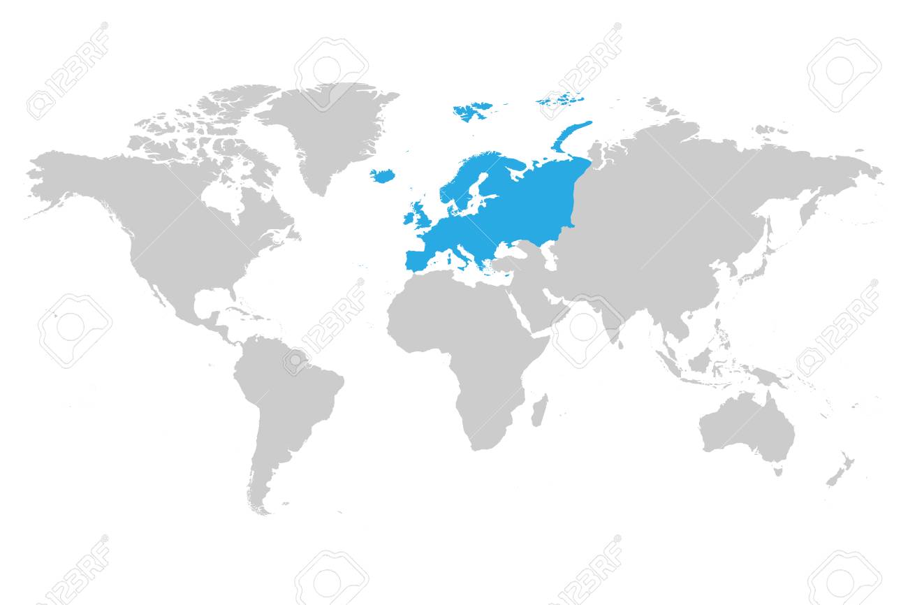 Europe Continent Blue Marked In Grey Silhouette Of World Map